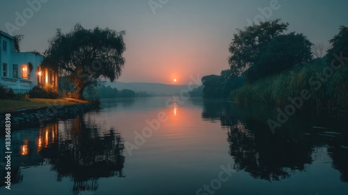 © Maulzz, Obraz premium Sunrise over calm river, house reflection