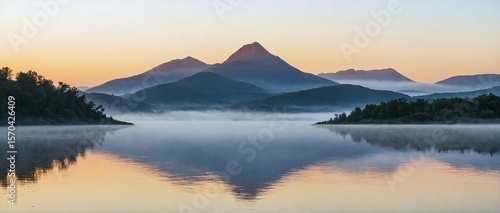 © Sidra, Obraz premium Sunrise Over Calm River With Fog Rolling Above Mountain Peaks