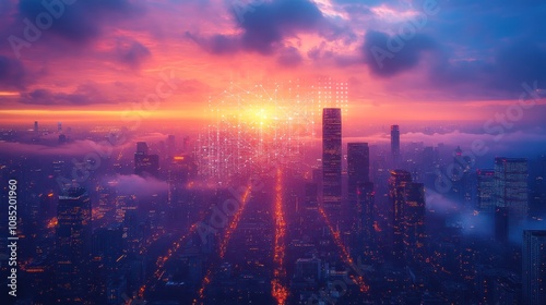 © harryaishi, Fototapeta premium Sunrise over cityscape with digital network overlay.