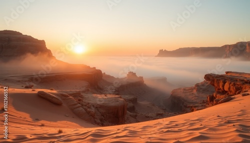 Naklejka premium Sunrise over desert canyon with morning mist.