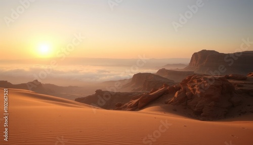 Naklejka premium Sunrise over desert landscape with sand dunes and rocky mountains.