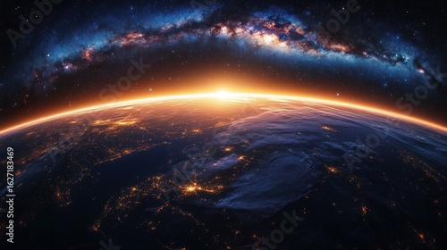 Fototapeta premium Sunrise over Earth from space with illuminated city lights and a vibrant starry galaxy arching across the dark cosmic sky, evoking wonder and awe