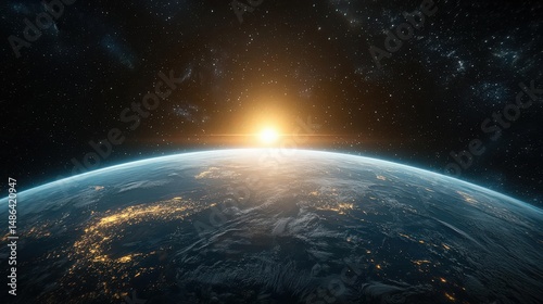 © Thanachart, Obraz premium Sunrise over Earth with a starry backdrop in space.