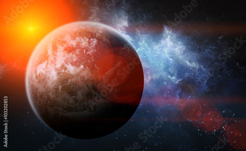 © sdecoret, Obraz premium Sunrise over exoplanet Earth in space