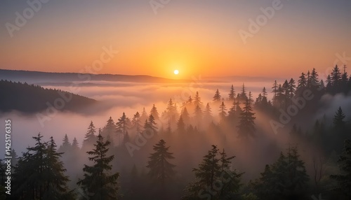 © Rifki Fachrudin, Fototapeta premium Sunrise Over Foggy Forest Valley with Rays of Light Shining Through