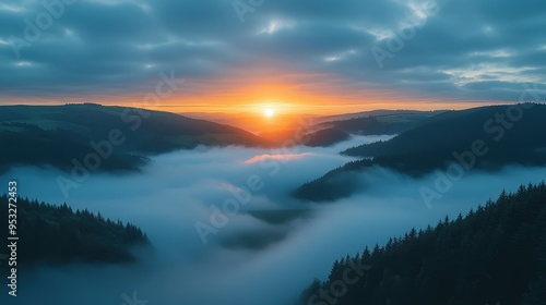 Obraz premium Sunrise Over Foggy Mountain Valley.