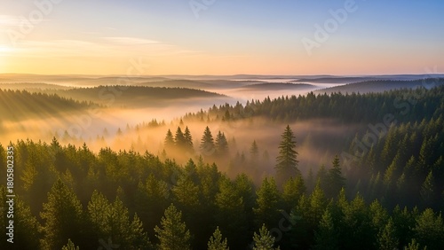 © Wan, Fototapeta premium Sunrise Over Forested Mountain Landscape with Mist in the Distance
