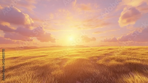 © Mariquita vector, Obraz premium Sunrise over golden fields with soft clouds in a vibrant sky