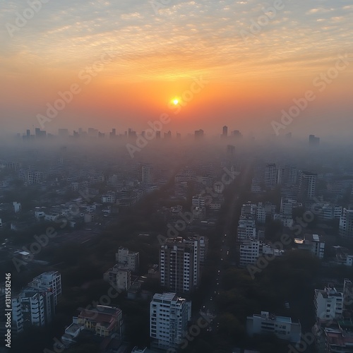 © Ardhana, Fototapeta premium Sunrise over hazy cityscape. (1)