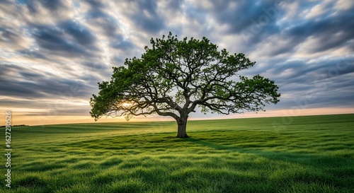 © Md, Obraz premium Sunrise Over Lone Tree in Green Field