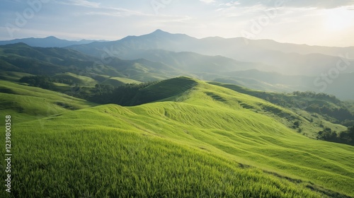 © Yopi, Naklejka premium Sunrise Over Lush Green Hills and Distant Mountains