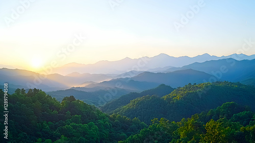 © artzone, Fototapeta premium Sunrise Over Lush Green Mountains