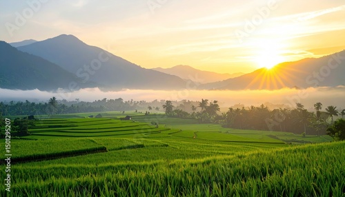 © Inur_Collections, Fototapeta premium Sunrise over lush green rice terraces with mist below mountains; golden light