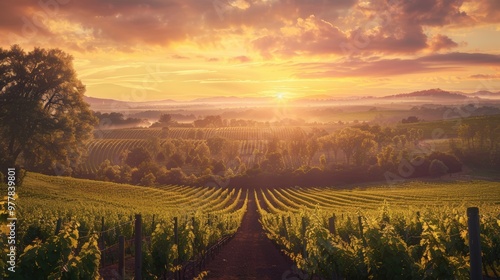 Naklejka premium Sunrise Over Lush Vineyard Rows in a Recovered War Region Representing Growth and Resilience