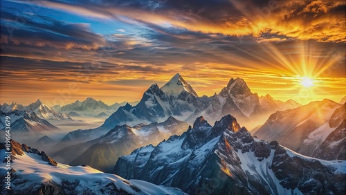 © Udomner, Fototapeta premium Sunrise over majestic mountain peaks , Sunrise, mountains, landscape, nature, dawn, morning, sunlight, snow-capped