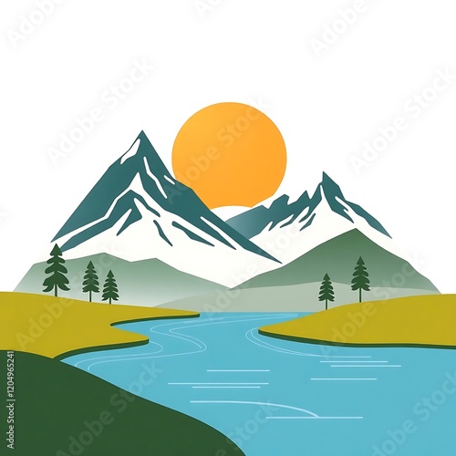 © Husna, Naklejka premium Sunrise over majestic mountains and river.