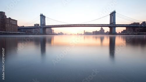 Fototapeta premium Sunrise over Manhattan Bridge, calm river reflection, city skyline