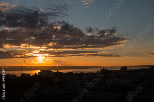 Fototapeta premium Sunrise over Mekong River in a Mukdahan city skylin