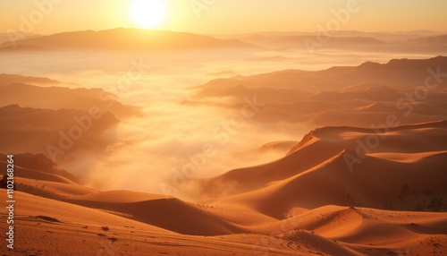 Naklejka premium Sunrise over misty desert dunes. (4)
