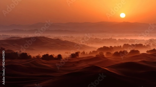 © Rehman, Fototapeta premium Sunrise over misty desert dunes