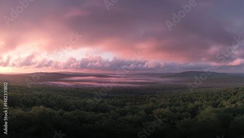 Obraz premium Sunrise over misty forest landscape