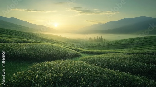 Obraz premium Sunrise over misty green valley landscape with rolling hills and distant...