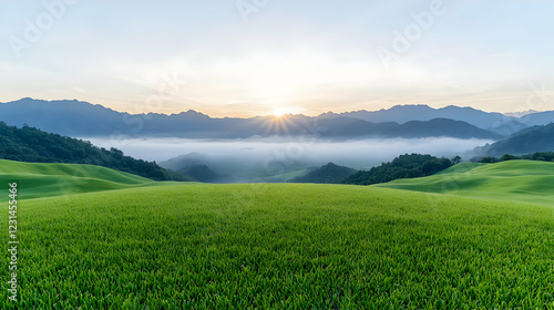 Fototapeta premium Sunrise over misty green valley, mountain backdrop, peaceful landscape,...