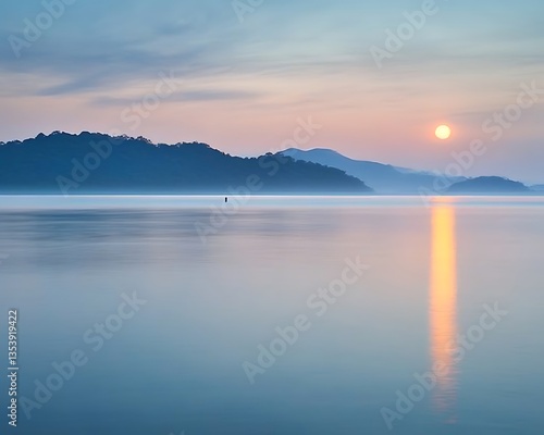 © Fafa, Fototapeta premium Sunrise over misty lake and hills.