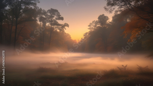 Fototapeta premium Sunrise Over Misty Meadow in Quiet Forest