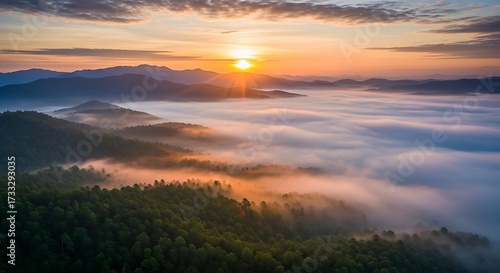 © sri, Obraz premium Sunrise over misty mountain landscape in North Carolina.