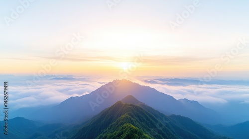 © bambang, Fototapeta premium Sunrise over misty mountain peaks