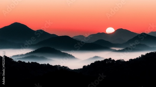 © Enggal Pitoyo, Obraz premium Sunrise over misty mountain range.