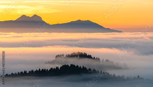 © Sungging, Obraz premium Sunrise over misty mountain range