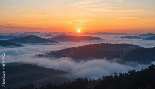 Obraz premium Sunrise over misty mountain range.