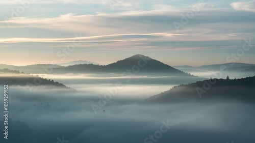 © BeeStock, Obraz premium Sunrise Over Misty Mountains A Tranquil Scene with Rolling Clouds and Green Hills