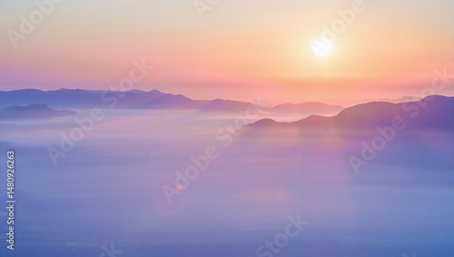 © Siamkeepsake, Fototapeta premium Sunrise over misty mountains with a soft glow illuminating the natural landscape beauty