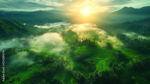 © afif, Naklejka premium Sunrise over misty rice terraces, mountain valley