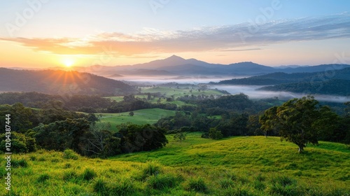 Obraz premium Sunrise over misty valley, green hills, scenic landscape, idyllic rural view,...