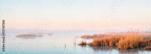Fototapeta premium Sunrise Over Misty Wetlands Reflecting Soft Light