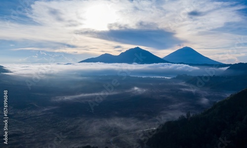 © Zenstratus, Fototapeta premium Sunrise over Mount Batur and Mount Agung, volcanoes in Bali, Indonesia. The landscape is filled with mist and clouds in the early morning light.
