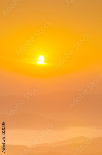 © Peerawut, Obraz premium Sunrise over mountain,covered with fog , soft focus.