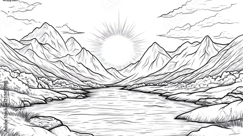 Fototapeta premium Sunrise over mountain lake, tranquil scene, nature illustration, coloring book page
