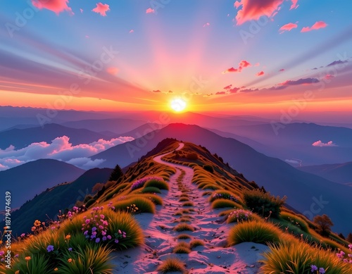 © CRISPIFLY, Obraz premium Sunrise Over Mountain Path with Glowing Heart