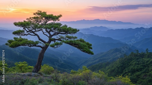 © alisya, Obraz premium Sunrise over mountain range, lone pine tree. Peaceful landscape for travel brochures