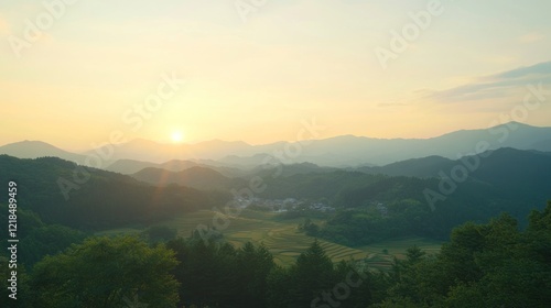 © NAIMAH, Fototapeta premium Sunrise over mountain valley village, peaceful rural landscape, idyllic scene
