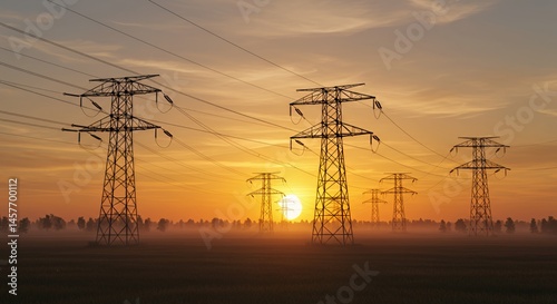 Fototapeta premium Sunrise over power lines in a misty field.
