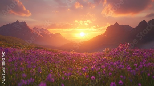 Fototapeta premium Sunrise Over Purple Wildflower Meadow with Majestic Mountain Peaks in...
