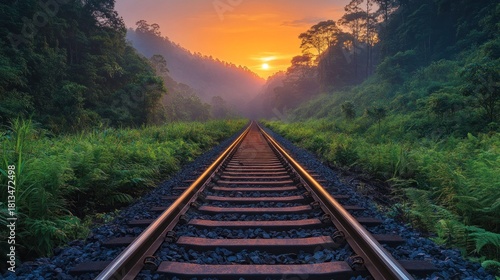 © RONNY, Fototapeta premium Sunrise over rainforest train tracks