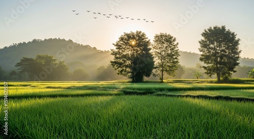 © ngamaz, Obraz premium Sunrise Over Rice Fields with Birds and Sun Shining Through Trees