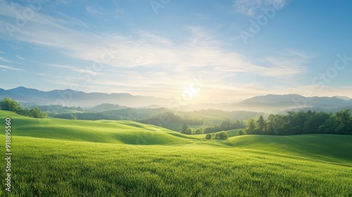Fototapeta premium Sunrise Over Rolling Green Hills with Clear Sky